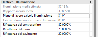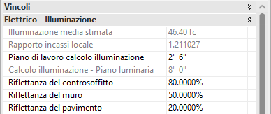 Le riflettanze del pavimento (pf), del muro (pw) e del controsoffitto (pc) sono proprietà di istanza del vano; il valore RCR viene calcolato come sopra descritto. Per interpolazione, è possibile attribuire al CU un valore di circa 40,8. Revit visualizza un valore di 40,9. La differenza è dovuta ai valori arrotondati della tabella stampata.