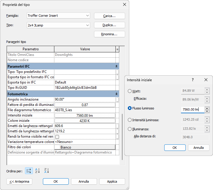 L'intensità iniziale e il fattore di perdita di illuminazione sono proprietà del tipo di dispositivo di illuminazione. È possibile accedere a queste proprietà dalla finestra di dialogo Proprietà del tipo.