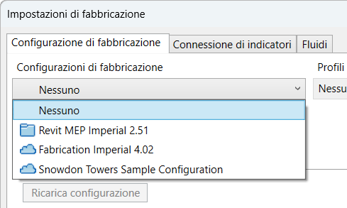 Utilizzare la finestra di dialogo Impostazioni di fabbricazione per specificare una configurazione di fabbricazione e un profilo e caricare i servizi di fabbricazione nel modello.