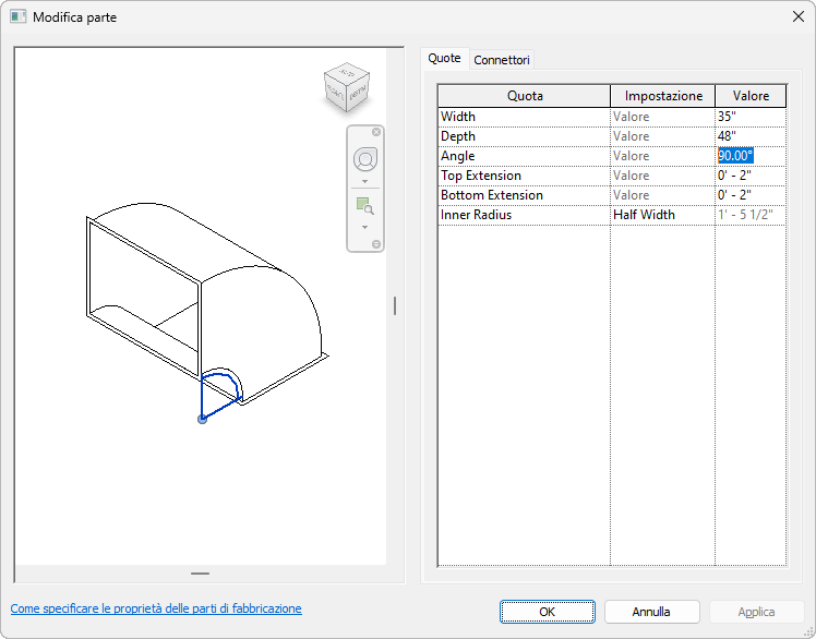 È possibile modificare una parte di fabbricazione in Revit per definire i valori di quota e le impostazioni del connettore necessari.