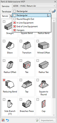 Selezionare le parti nella tavolozza Parti di fabbricazione MEP che non verranno utilizzate con gli strumenti di riempimento automatico.