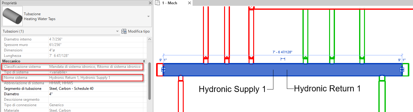 Se i circuiti secondari sono connessi al collettore utilizzando le connessioni dei giunti, il collettore conterrà i sistemi di mandata e ritorno del circuito primario. Questi sistemi verranno divisi al centro della tubazione come mostrato dalle etichette nell'immagine seguente. Tenere presente che i nomi e le classificazioni di sistema vengono visualizzate nella tavolozza Proprietà.