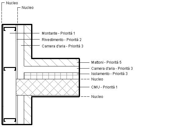 Nell'illustrazione seguente, gli strati con priorità superiore si uniscono prima di quelli con priorità inferiore. Lo strato CMU con Priorità 1 del muro orizzontale attraversa tutti gli strati fino a raggiungere lo strato montante con Priorità 1 del muro verticale. Osservare che l'isolamento nel muro orizzontale non attraversa la camera d'aria del muro verticale, in quanto sono entrambi di Priorità 3 ed esterni allo strato del nucleo.
