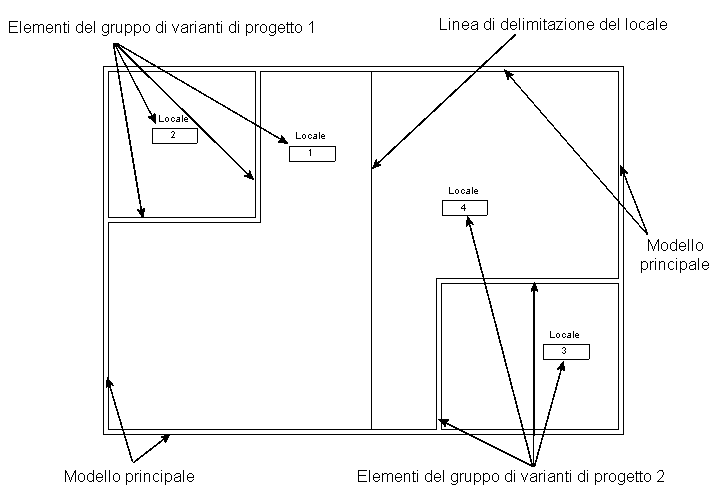 Se la forma, le dimensioni o la posizione di un locale non cambiano da una variante all'altra e si desidera assegnare le stesse proprietà di locale a diverse varianti, il locale deve rimanere nel modello principale.