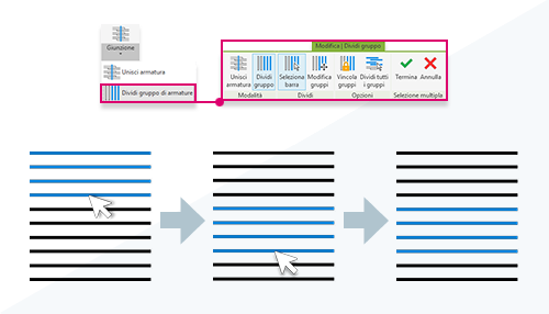 È possibile dividere uno o più gruppi di armature in corrispondenza della barra selezionata o del riferimento di linea intersecante.