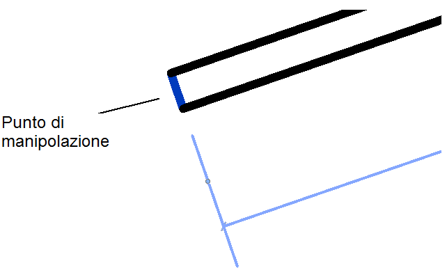 Se un muro è selezionato in una vista di pianta, posizionare il cursore su un controllo estremità (punto blu) e premere TAB per visualizzare un punto di manipolazione. Se un muro è evidenziato in una vista di prospetto o 3D, premere TAB per visualizzare l'intero bordo più vicino al cursore come punto di manipolazione che è possibile trascinare per ridimensionare il muro. Il bordo che funge da punto di manipolazione è blu (o del colore impostato per la selezione) quando lo si trascina e rimane selezionato per ulteriori operazioni di ridimensionamento fino a quando non si preme ESC o si fa clic sull'area di disegno.