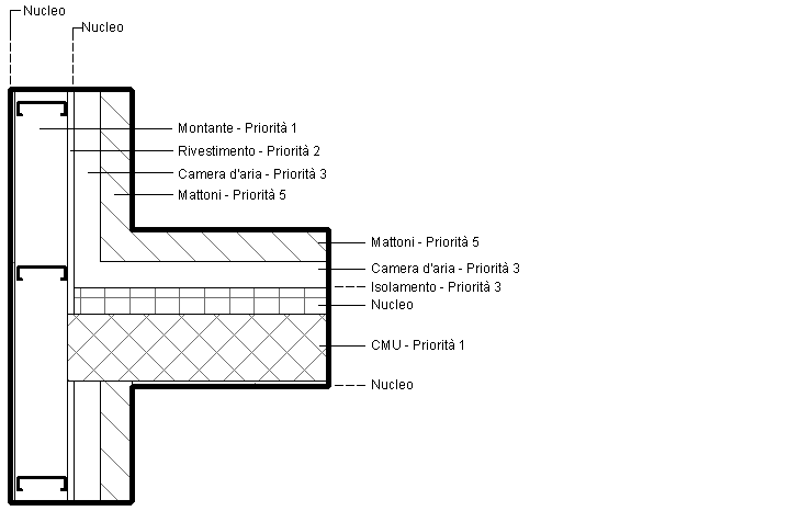 Nell'illustrazione seguente, gli strati con priorità superiore si uniscono prima di quelli con priorità inferiore. Lo strato CMU con Priorità 1 del muro orizzontale attraversa tutti gli strati fino a raggiungere lo strato montante con Priorità 1 del muro verticale. Osservare che l'isolamento nel muro orizzontale non attraversa la camera d'aria del muro verticale, in quanto sono entrambi di Priorità 3 ed esterni allo strato del nucleo.