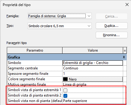 - Per visualizzare i simboli circolari in corrispondenza del punto finale delle linee di griglia in una vista di pianta, selezionare Simboli vista pianta estremità 2 (default).