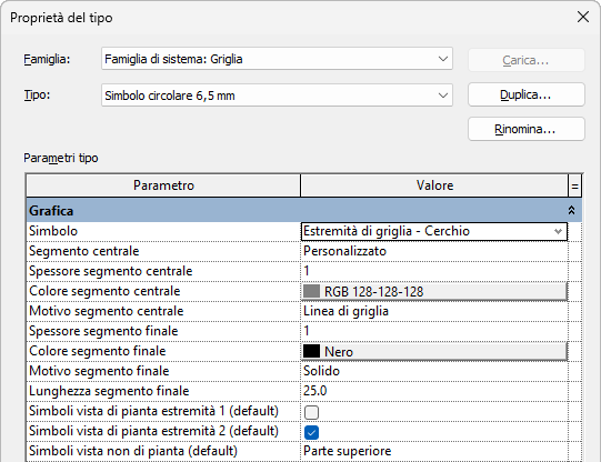 - Nascondere il segmento centrale delle linee di griglia per creare uno spazio, visualizzando così solo i segmenti finali nelle viste. È possibile modificare il tipo di griglia con simbolo circolare e spazio oppure creare un tipo personalizzato.