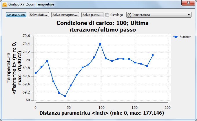 Nota Come previsto, la curva di temperatura superiore è data dallo scenario Winter, mentre quella inferiore è data da Summer. Al centro della curva di Summer, vediamo un brusco aumento di temperatura (circa 2 °F in 40 pollici). Ciò è probabilmente dovuto al calore del corpo dell'occupante.