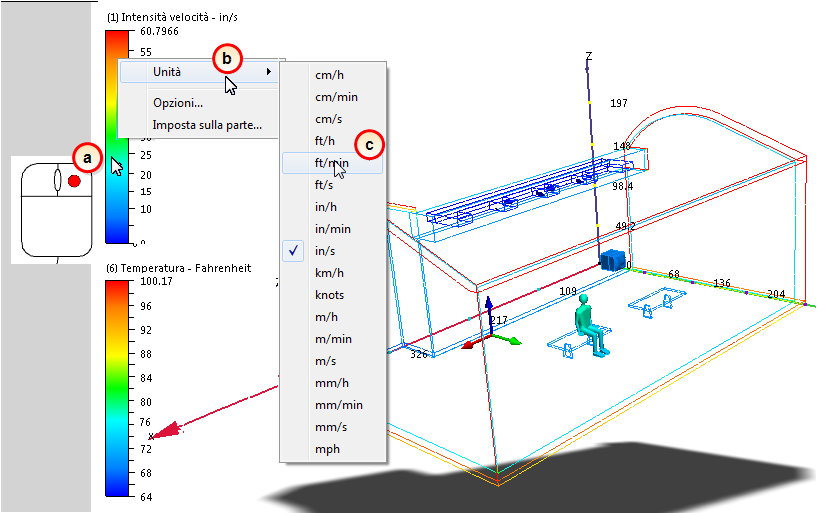 Nota Questa opzione consente di creare un'isosuperficie che mostra la temperatura in tutti i punti del modello in cui la velocità di spostamento del flusso è di 28 piedi/min.