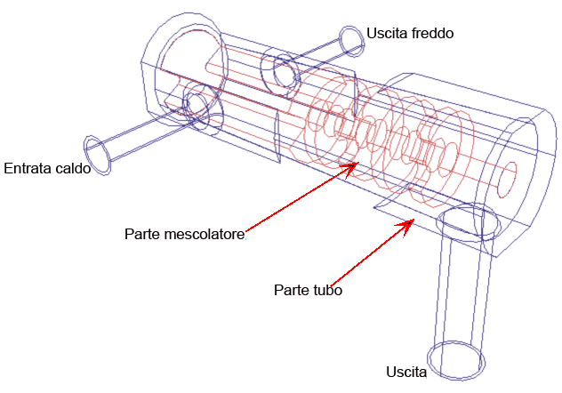 In questa esercitazione, studiamo il flusso d'acqua attraverso un semplice rubinetto per uso domestico. Nel rubinetto entrano un flusso di acqua calda e uno di acqua fredda, che si combinano nella regione di miscelazione ed escono attraverso l'uscita.