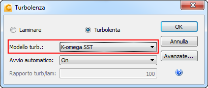 Fare clic sul pulsante Turbolenza. Nella finestra di dialogo Turbolenza, impostare Modello turb. su K-omega SST e fare clic su OK: