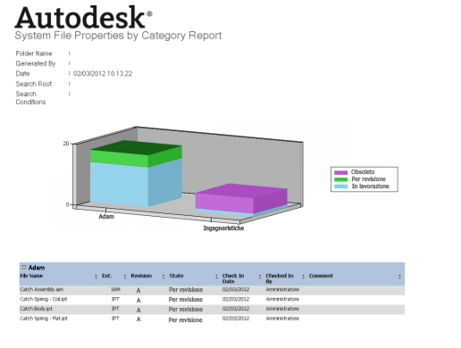 Autodesk Vault Client include alcuni modelli di rapporto. In questi modelli è presente una tavolozza di colori per i grafici, ma non viene specificato quale colore è assegnato ad ogni elemento del grafico. Per assegnare i colori agli elementi del grafico, utilizzare la funzionalità di mappatura dei dati. La codifica degli elementi del grafico con i colori consente una rapida e più agevole identificazione dei dati del modello.