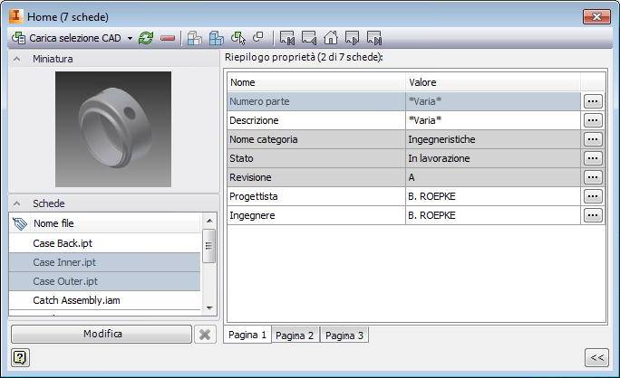 Ogni volta che una parte viene selezionata nell'area di disegno CAD oppure nell'elenco del browser Modello o Vault, viene evidenziata nell'area di disegno e nell'elenco, e la scheda dati viene aggiornata automaticamente per mostrare le informazioni relative a quella parte.