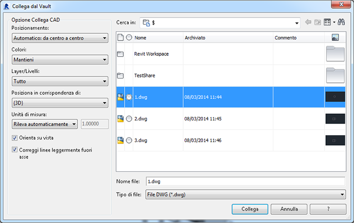 È possibile inserire un file DWG memorizzato in un Vault nel progetto Revit corrente.