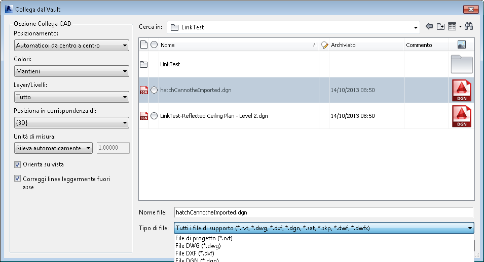 È possibile selezionare una preferenza di posizionamento quando si collega un file nel progetto Revit corrente.