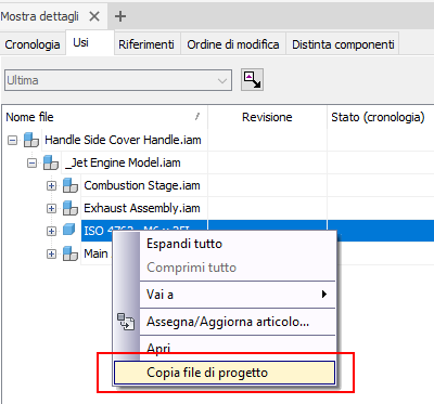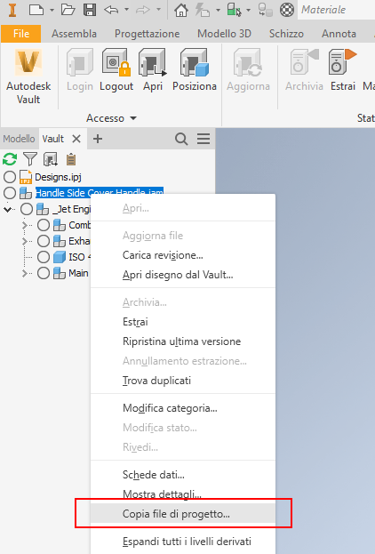In Inventor, fare clic con il pulsante destro del mouse su un file nel browser Vault e scegliere Copia file di progetto.