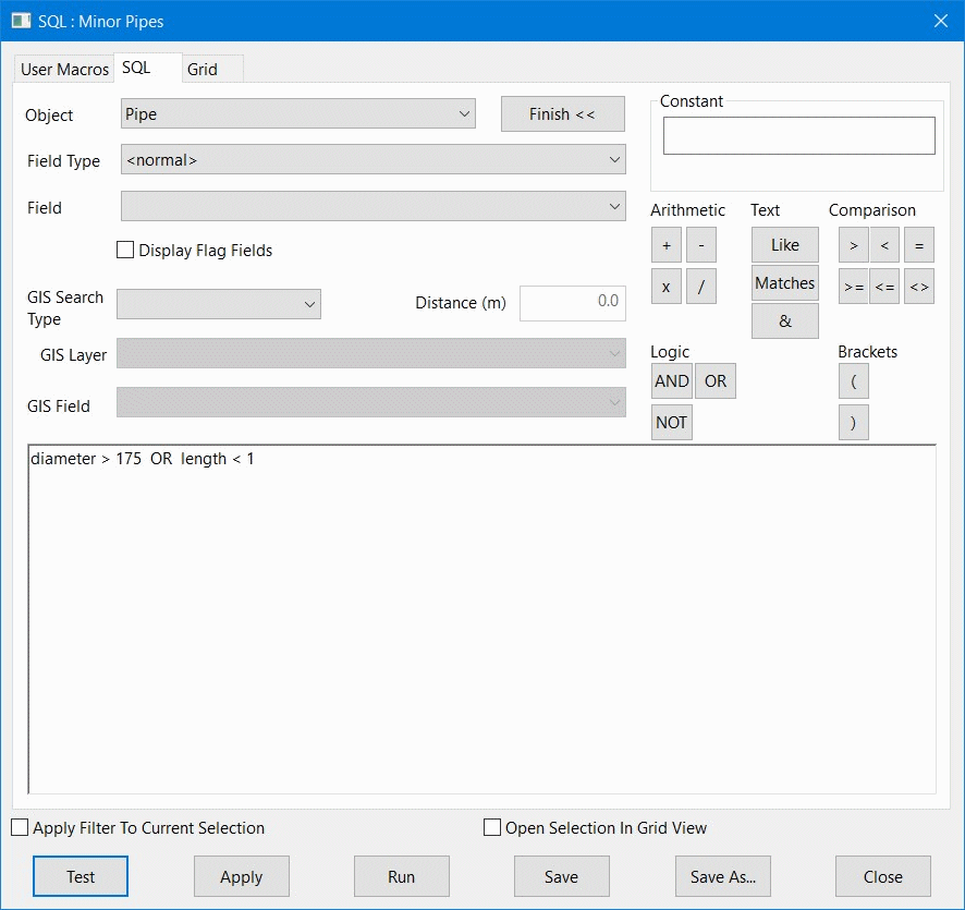 - Eseguire la query e salvare la selezione nella cartella Selezioni come 'Minor Pipes'.