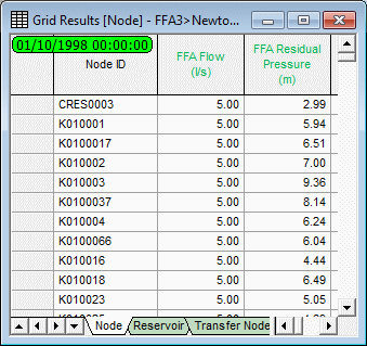 La vista griglia Nodi nella griglia Nodi include i campi dei risultati Portata FFA e FFA pressione residuale. Questi sono campi che variano nel tempo ed è possibile vedere che i valori cambiano durante la riproduzione.