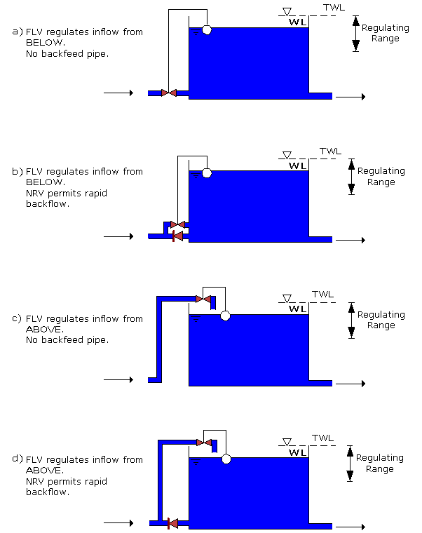 I tipi più recenti sono molto più sofisticati, ma il principio rimane più o meno lo stesso. Una valvola galleggiante viene posizionata nella condotta di immissione di un serbatoio. Le disposizioni tipiche sono mostrate nella figura seguente: