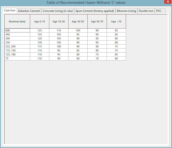 I valori nella tabella di scabrezza Hazen-Williams provengono dal Manual of British Water Engineering Practice (4th Edition) Volume II Engineering Practice, Tabella XXXIII.