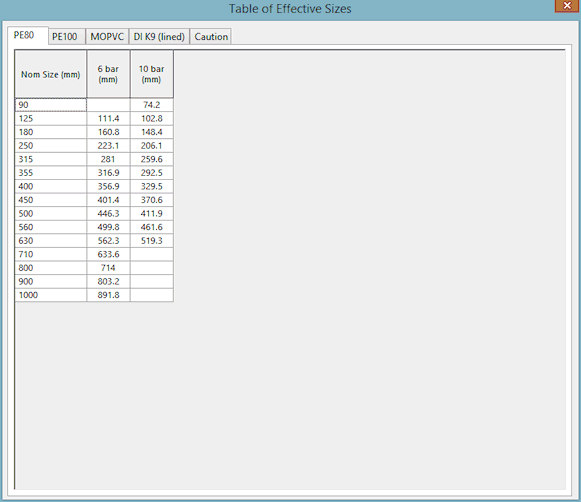 La tabella delle dimensioni nominali fornisce i diametri interni effettivi per vari materiali delle condotte a diverse pressioni di esercizio. È inclusa come tabella nel software solo per riferimento.