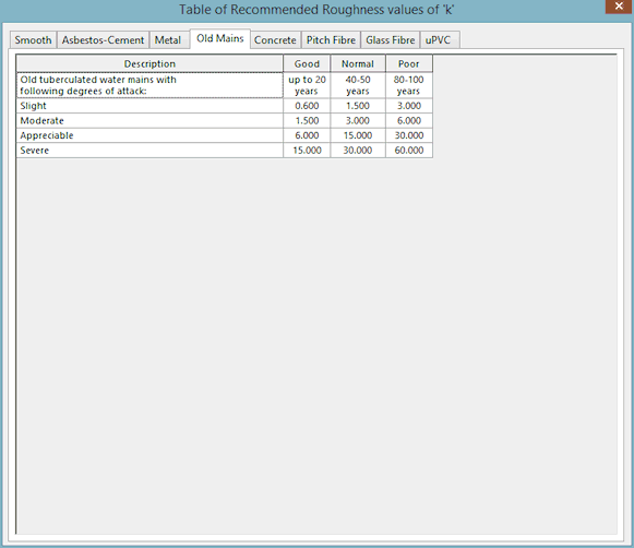 I valori nella tabella di scabrezza Colebrook-White provengono dalla tabella 38 dei grafici di Wallingford.