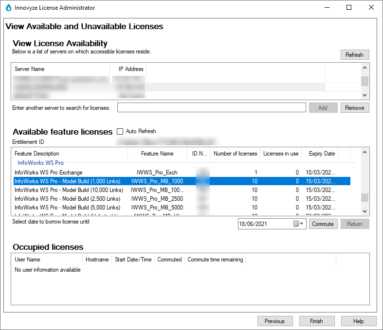 Innovyze offre una licenza basata su abbonamento. La licenza Innovyze è semplice da installare ed è possibile aggiungere altri utenti o software o funzionalità alla licenza Innovyze da remoto con una minima interazione da parte dell'utente. Sarà inoltre possibile vedere facilmente chi sta eseguendo cosa mediante Innovyze License Administrator (ILA), di cui è mostrato un esempio di seguito: