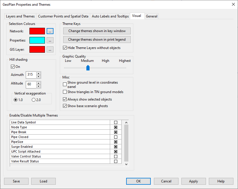 Questa pagina controlla gli effetti visivi della finestra Planimetria, come il colore della selezione, le impostazioni di ombreggiatura, le chiavi del tematismo e la qualità grafica del tematismo.