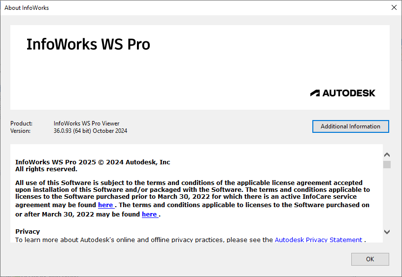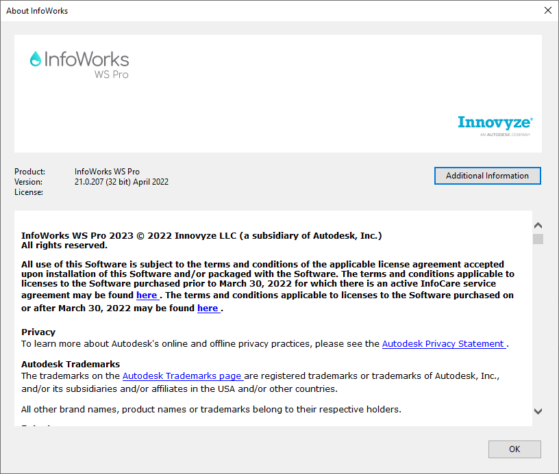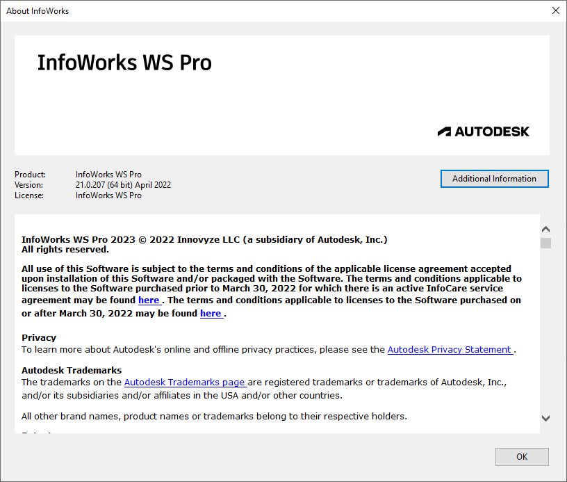 Nel riquadro Informazioni su InfoWorks WS Pro vengono visualizzate informazioni utili sull'installazione corrente di InfoWorks WS Pro, nonché informazioni sulla privacy e sui marchi registrati Autodesk.