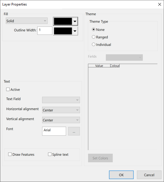 Il testo associato agli oggetti layer può essere visualizzato selezionando la casella Attivo. Modificare l'aspetto del testo utilizzando le caselle a discesa. Selezionare la casella Funzionalità di disegno per rendere visibili gli oggetti del layer. Selezionare la casella di testo Spline per visualizzare il testo con l'orientamento salvato nel file di layer (se questa casella è deselezionata, il testo verrà visualizzato orizzontalmente). |