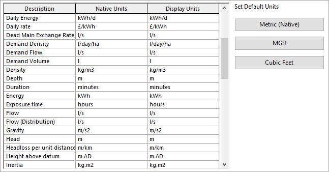 Questa pagina consente di scegliere le unità di misura visualizzate nelle visualizzazioni di InfoWorks WS Pro, incluse le griglie e i fogli proprietà.