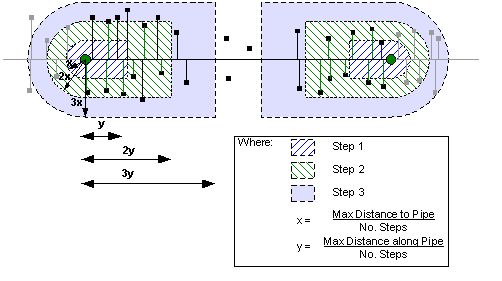 Le regole Distanza max dalla condotta e Distanza massima lungo la condotta specificate dall'utente rappresentano i limiti da utilizzare nell'ultimo passaggio di distanza. Questi limiti vengono divisi per il numero di passaggi di distanza per calcolare la quantità necessaria per incrementare i parametri Distanza max dalla condotta e Distanza massima lungo la condotta in ogni fase di allocazione.