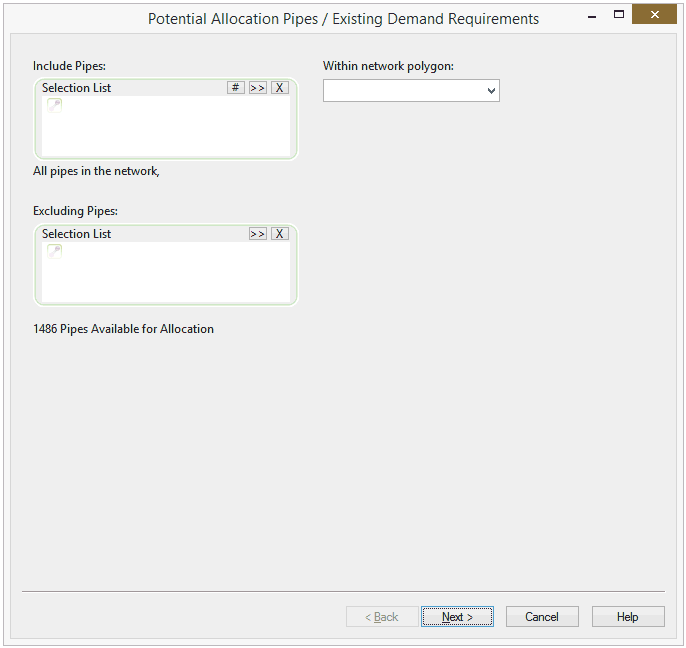 Consente di limitare le condotte ad un gruppo specifico includendo una selezione. Trascinare uno o più elenchi di selezione nella casella o selezionare il pulsante ... per cercare gli elenchi di selezione. In alternativa, selezionare le condotte nella finestra Planimetria, quindi fare clic sul pulsante Attivo per scegliere la selezione corrente. Viene visualizzata un'opzione che consente di includere le condotte tra i nodi selezionati. Se la casella Elenco di selezione viene lasciata vuota, in InfoWorks si presume che tutte le condotte siano disponibili per l'allocazione. |