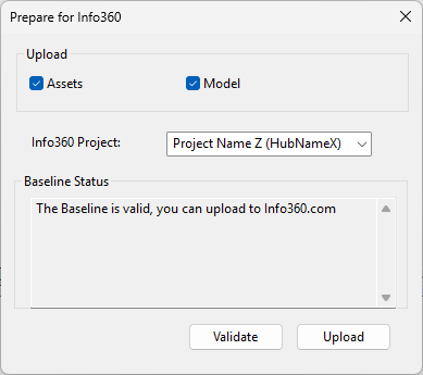 L'opzione Preparazione per Info360 consente di convalidare e caricare l'asset e/o il modello del modello base in Info360 nel server cloud.