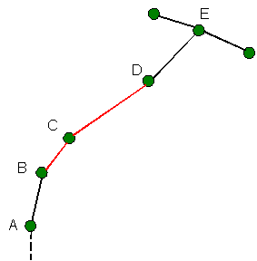 Quando si deducono i valori per un determinato collegamento, InfoWorks esegue la ricerca a monte e a valle del collegamento attraverso i nodi connessi a due soli collegamenti. La ricerca terminerà in corrispondenza di: