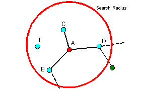 EsempioIl contributo di ciascun nodo alla quota altimetrica del nodo di destinazione è ponderato in base alla funzione dell'inverso del quadrato della distanza dal nodo di confine. Il peso diminuisce all'aumentare della distanza dal nodo di destinazione; pertanto la quota altimetrica dei nodi più vicini al nodo di destinazione contribuirà maggiormente alla quota altimetrica calcolata. Se un nodo entro il raggio di ricerca non ha una quota altimetrica, verrà ignorato durante il processo di calcolo. |