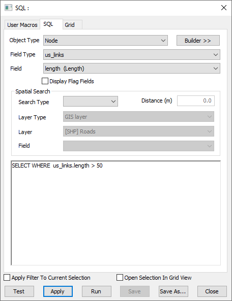 consente di selezionare tutti i nodi che hanno almeno un collegamento a monte con una lunghezza superiore a 50.