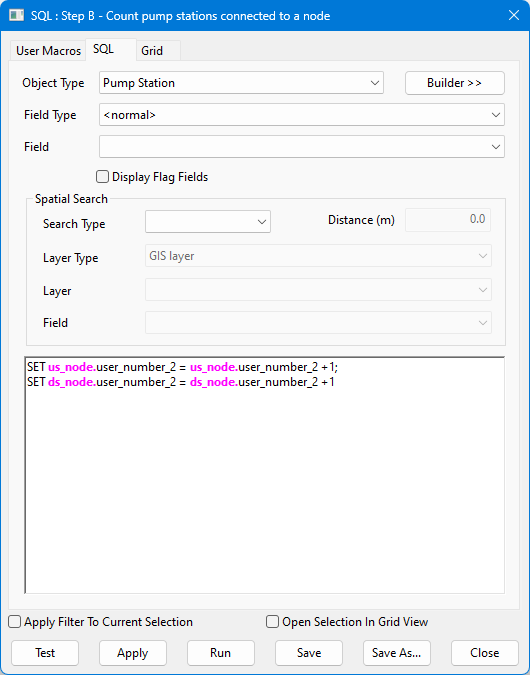 Ora vengono conteggiati tutti i collegamenti agli oggetti stazione di pompaggio incrementando il numero nel campo del numero utente per ciascun collegamento. Notare che il campo Tipo di oggetto per questa query è impostato su Stazione di pompaggio.