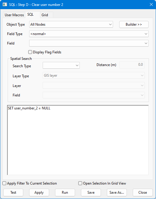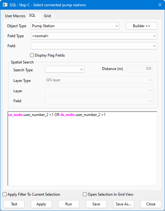 Nella rete di esempio in questione, non è consentito collegare direttamente un oggetto stazione di pompaggio ad un altro oggetto stazione di pompaggio. Questa serie di query SQL utilizza il campo definito dall'utente user_number_2 per contare le connessioni alle stazioni di pompaggio. Alla fine, verrà selezionata qualsiasi stazione di pompaggio collegata direttamente ad un'altra stazione di pompaggio.