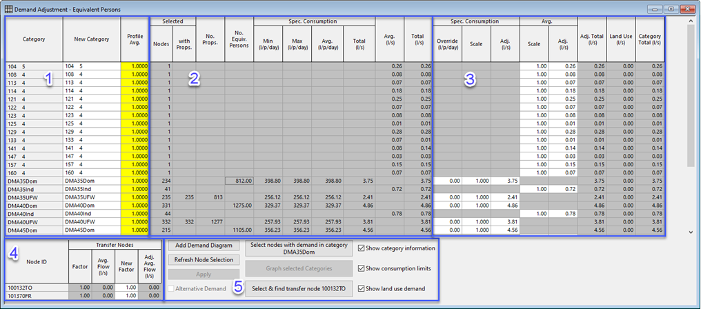 Nell'area sinistra della vista sono elencate le categorie di domanda utilizzate dai nodi nella selezione, con alcune righe aggiuntive per i totali. Se è presente un diagramma di domanda corrente, le colonne Nuova categoria e Media profilo vengono compilate con i valori effettivi, consentendo di apportare modifiche globali alle categorie di domanda applicate a nodi specifici. Facendo clic su una categoria nella colonna Nuova categoria, verrà visualizzato un elenco a discesa con tutte le categorie di richiesta disponibili, consentendo di assegnare una categoria diversa a questi nodi. Queste categorie vengono sempre visualizzate indipendentemente dal fatto che alla vista sia associato o meno un diagramma di domanda corrente. Tuttavia, se non è presente alcun diagramma di domanda corrente: