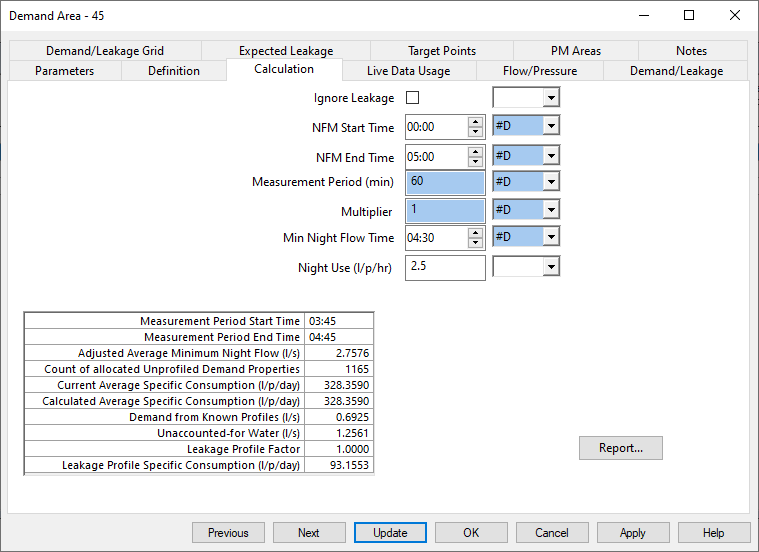Fare clic sul pulsante Rapporto per visualizzare un rapporto contenente tabelle di riepilogo delle statistiche dell'area di domanda, informazioni sulle categorie di domanda e grafici del profilo di domanda e del bilancio delle portate. Il rapporto può essere copiato negli Appunti e quindi incollato in un'altra applicazione o salvato come file html.