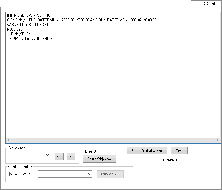 Immettere nella casella di testo lo script UPC che descrive i controlli logici per l'oggetto di rete corrente. |