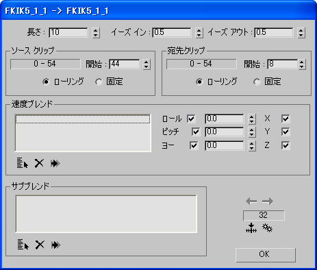 - このチェック ボックスにチェックマークが付いている場合は、トランジションの際、ヨー(Z)角度が累積されます。チェックマークが付いていない場合、角度は単純に次のクリップとブレンドされます。既定値ではチェックマークが付いています。