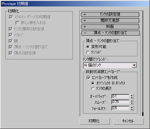 [Physique 初期値](Physique Initialization)ダイアログ ボックスを使用すると、リンク パラメータおよびエンベロープのタイプとサイズを指定して、Physique リンクを作成できます。