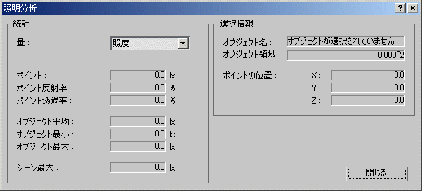 ライト レベルを照会し、データを分析して、レポートを作成するには、[照明分析](Lighting Analysis)ダイアログ ボックスを使用します。このダイアログ ボックスには、マテリアルの反射率、透過率、および輝度に関するレンダリング データが表示されます。