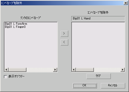 [エンベロープ](Envelope)サブオブジェクト レベルでこのダイアログ ボックスを使用すると、他のリンクに影響するリンクを除外できます。たとえば、左大腿リンクへ影響を及ぼすグループから右大腿リンクを除外できます。また、人差し指のエンベロープをスケール調整して中指上の頂点に影響するのを避ける代わりに、人差し指のリンクから中指のリンクを除外します。