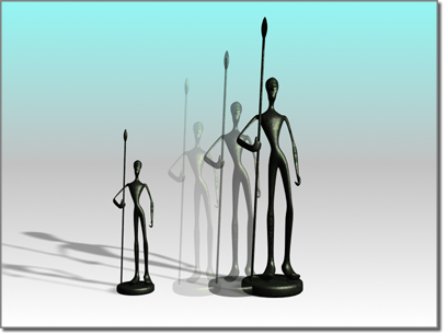 Shift+スケールで、ローカル基点以外の中心を利用すると、徐々にスケールするオブジェクトの配列ができます。ここでも、縮小は中心に向かって行われ、拡大は中心から遠ざかる方向に行われます。ただし、次に述べるように、この効果は特定のスケール オプションと軸コンストレイントに限定されています。