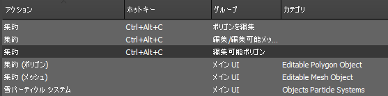 - [アクション](Action)、[ホットキー](Hotkey)、[グループ](Group)、[カテゴリ](Category)の列